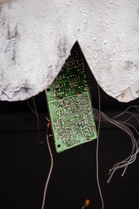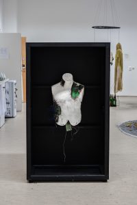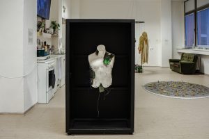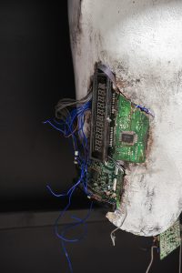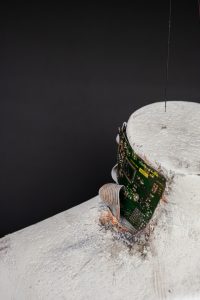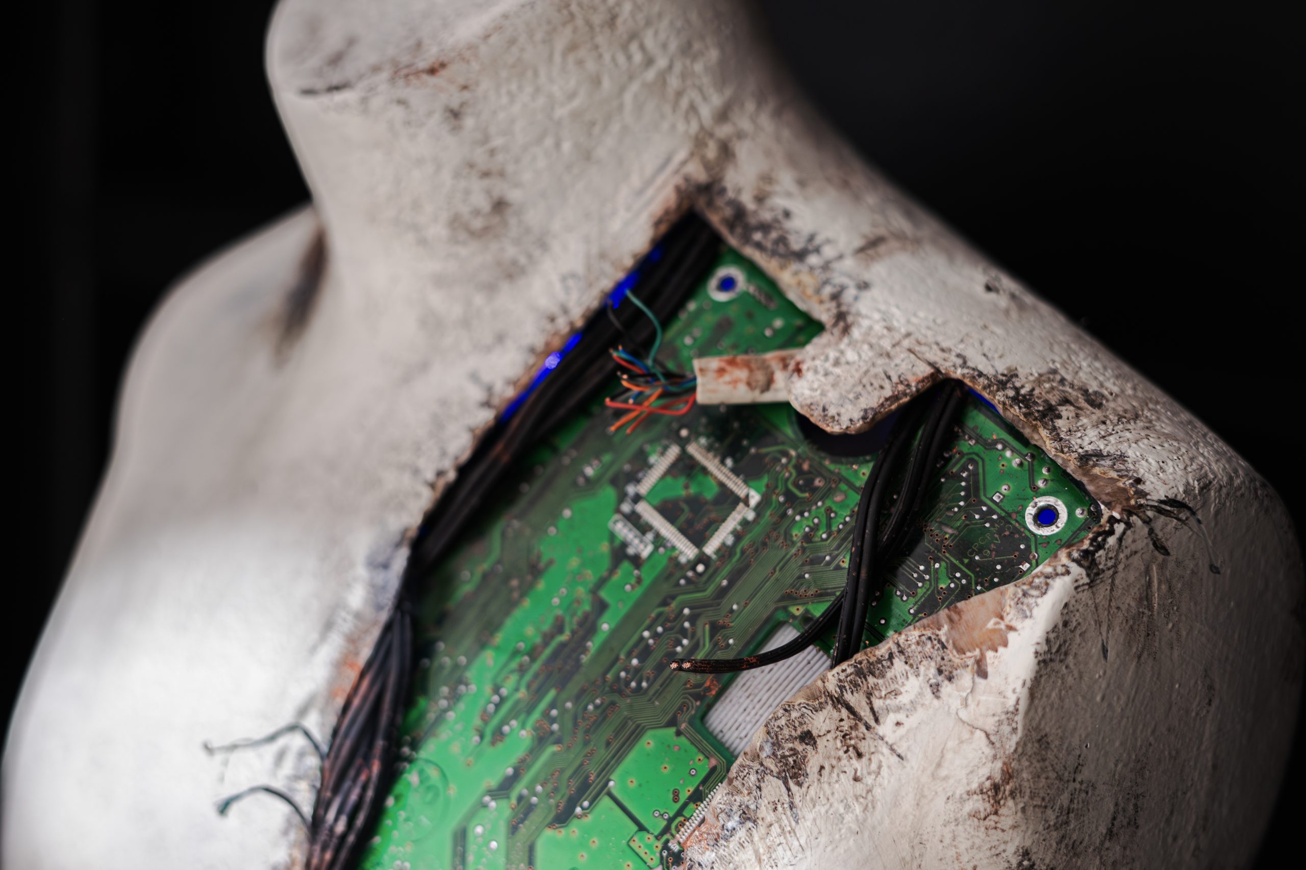 An android torso made of electronic waste, placed inside a black display case, appears as a “future artifact of the past” — an object of archaeological inquiry. It raises questions about human value in an era of data extraction and about our relationship to our own identity, the body and information. The work draws on retro sci-fi aesthetics and visual imaginaries of the future from the second half of the 20th century, visualizing a technological development that has already surpassed many of these earlier fantasies.