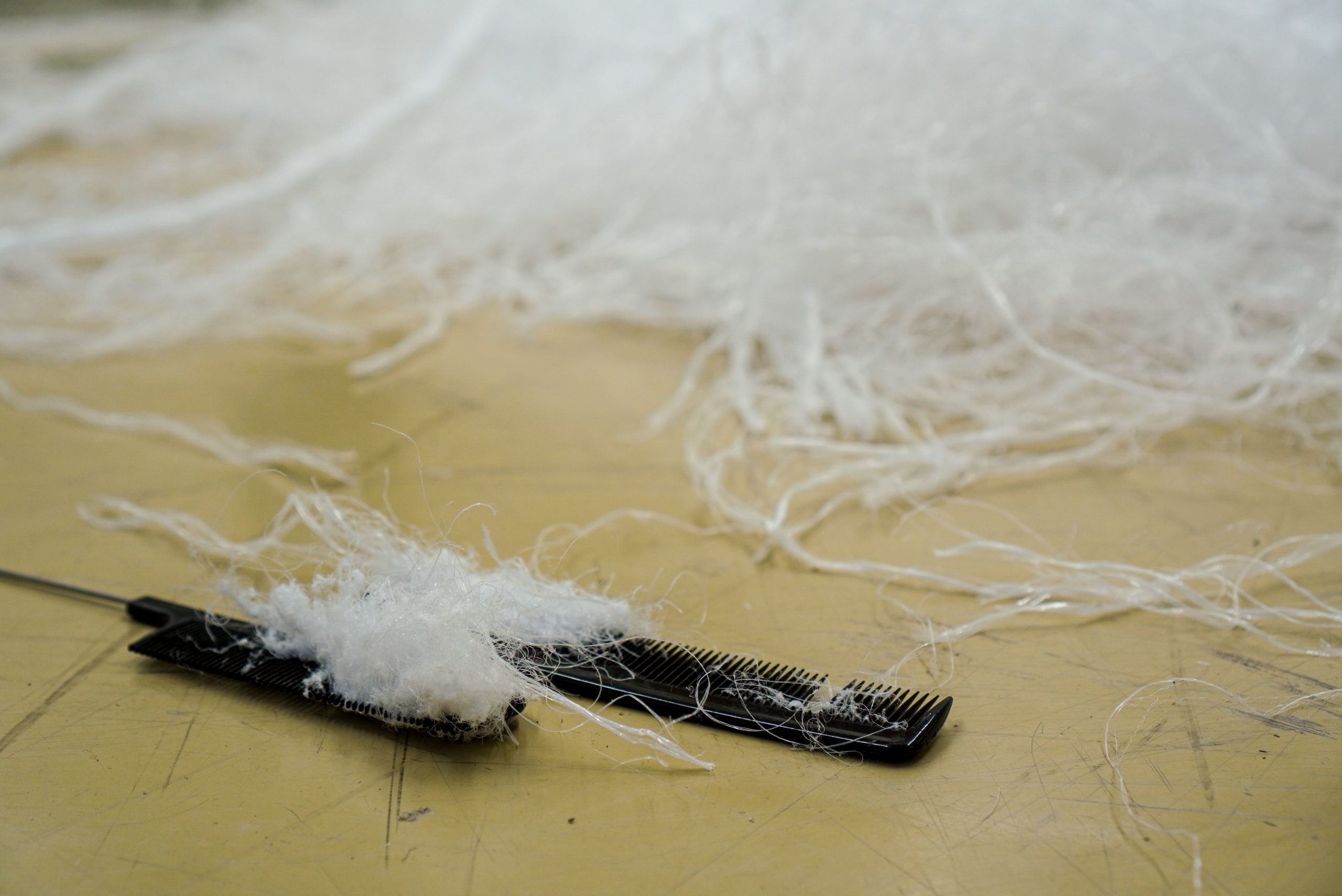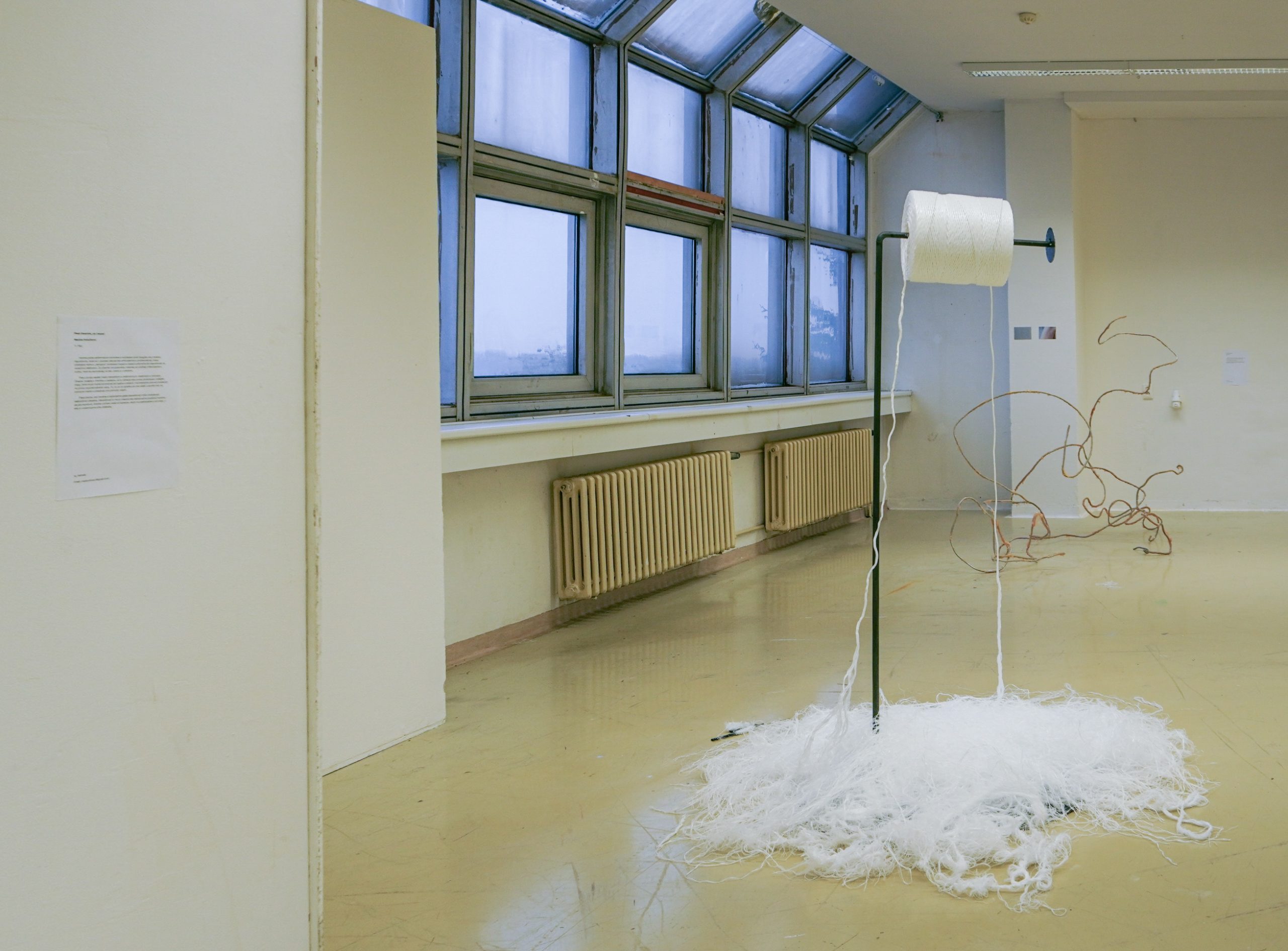 Autorka počas performancie rozmotáva a rozčesáva kotúč špagátu ako metaforu starostlivosti, ktorá sa v procese ukazuje ako ambivalentná.